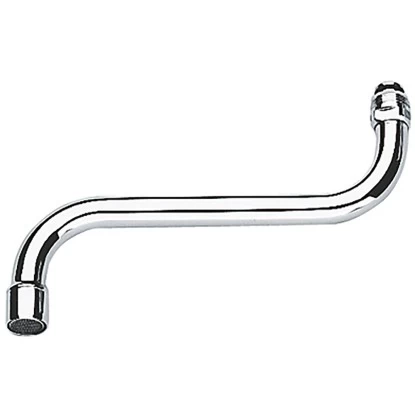 Der Grohe Rohrauslauf für die Küchen-Wandbatterie ist schwenkbar und verfügt über einen Mousseur. Die Ausladung des Rohrauslaufes beträgt 200 mm. Das Material besteht aus DR-Messing.