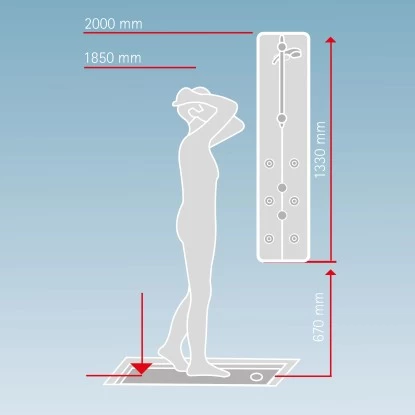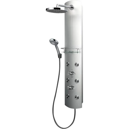 Der Dusch Master besitzt ein +38 °C Sicherheits-Thermostat sowie eine elegante Tellerkopfbrause. Der Korpus besteht aus Aluminium. Die Massagedüsen sind justierbar. Die Handbrause mit 3 Strahlarten lässt sich leicht reinigen.