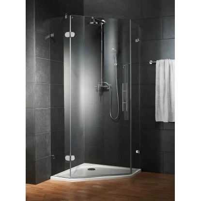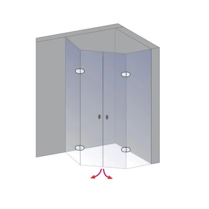Die 4-teilige Fünfeckdusche besteht aus 8 mm Einscheiben-Sicherheitsglas. Die innen bündigen Halbkreis-Scharniere sind bereits vormontiert und schließen innen bündig mit der Glasfläche ab. Die Reinigung Ihrer Duschkabine wird damit zum Kinderspiel. Durch den verdeckten Heb-Senk-Mechanismus der Scharniere hebt die Tür beim Öffnen leicht an und senkt sich beim Schließen wieder ab. Erhöhte Dichtigkeit und zuverlässiges Schließverhalten sind dadurch garantiert. Der verdeckte Heb-Senk-Mechanismus wird erst beim Bewegen der Tür bemerkbar.