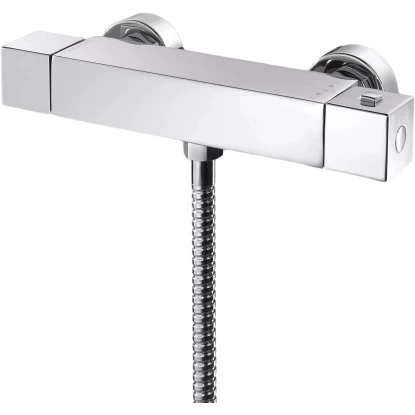 Das eckige Thermostat besitzt ein +38 °C Sperre. Es ist mit fast allen Duschsystemen mit Umsteller kompatibel.